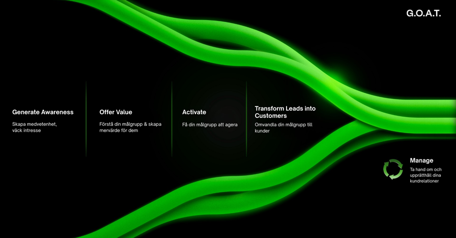 Det finns många olika funnel-modeller och de består oftast av fyra till fem steg. Nedan hittar du Wuohis egen G.O.A.T. Funnel™ – en modell som är särskilt framtagen för att möta behoven inom heltäckande digital marknadsföring.